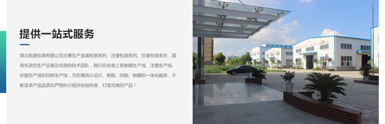湖北銘塑包裝有限公司一家集研發(fā)、生產(chǎn)、銷售于一體的較優(yōu)秀民營企業(yè),技術(shù)力量雄厚,產(chǎn)品質(zhì)量可靠。位于交通暢順,百業(yè)興旺、經(jīng)濟(jì)富裕、政策開放的孝感開發(fā)區(qū)域。我們企業(yè)的營銷戰(zhàn)略是以建筑為土壤,以產(chǎn)品為種子,以質(zhì)量為肥料,讓綠色鋪滿全球。憑借多年來的行業(yè)經(jīng)驗,公司不斷進(jìn)行創(chuàng)新和研發(fā),為市場提供更廣泛的產(chǎn)品應(yīng)用領(lǐng)域和更好環(huán)保節(jié)能產(chǎn)品,為國家能源環(huán)保戰(zhàn)略和可持續(xù)發(fā)展戰(zhàn)略作出應(yīng)有的貢獻(xiàn)。     湖北銘塑包裝有限公司主要生產(chǎn)金屬包裝系列、注塑包裝系列、吹塑包裝系列,具有先進(jìn)的生產(chǎn)設(shè)備及優(yōu)良的技術(shù)團(tuán)隊,我們在包裝上有制罐生產(chǎn)線、注塑生產(chǎn)線、吹塑生產(chǎn)線和印鐵生產(chǎn)線,為您提供從設(shè)計、制版、印刷、制罐的一體化服務(wù),不斷追求產(chǎn)品品質(zhì)和嚴(yán)格執(zhí)行相關(guān)檢驗標(biāo)準(zhǔn),打造更好的產(chǎn)品!